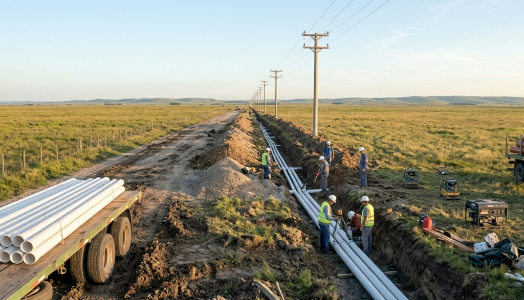 Redes de Agua Potable: Perforaciones, tendido de cañerías maestras y conexiones domiciliarias con materiales de alta durabilidad.